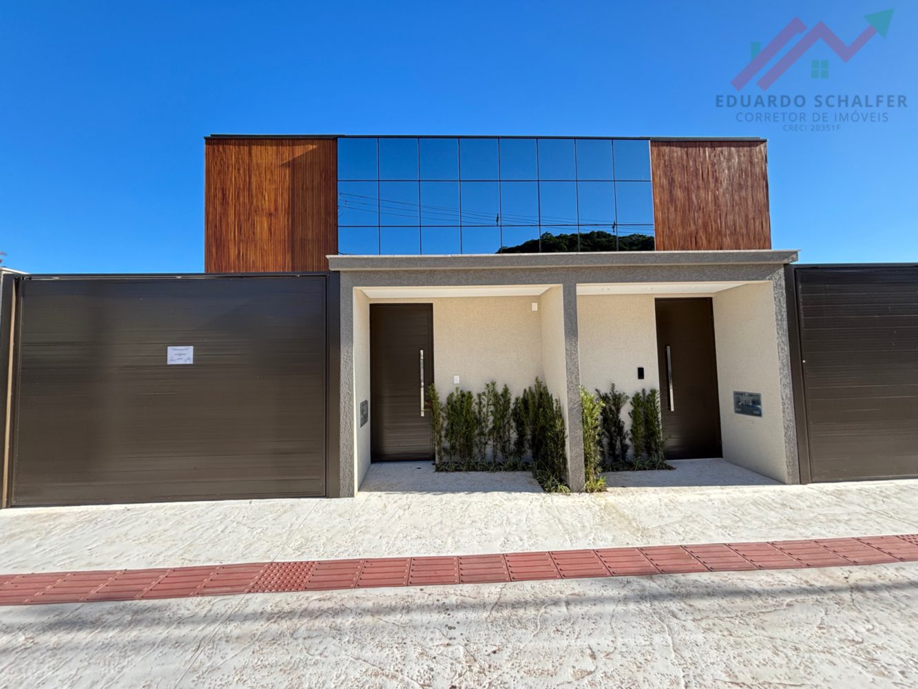 Fachada em pele de vidro e ripado de madeira grapia ;